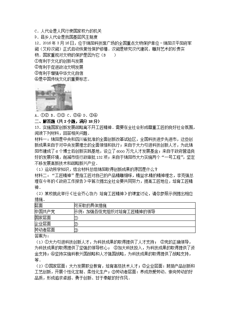 【文档名称】 2016四川省绵阳市中考政治真题及答案(Word版).doc