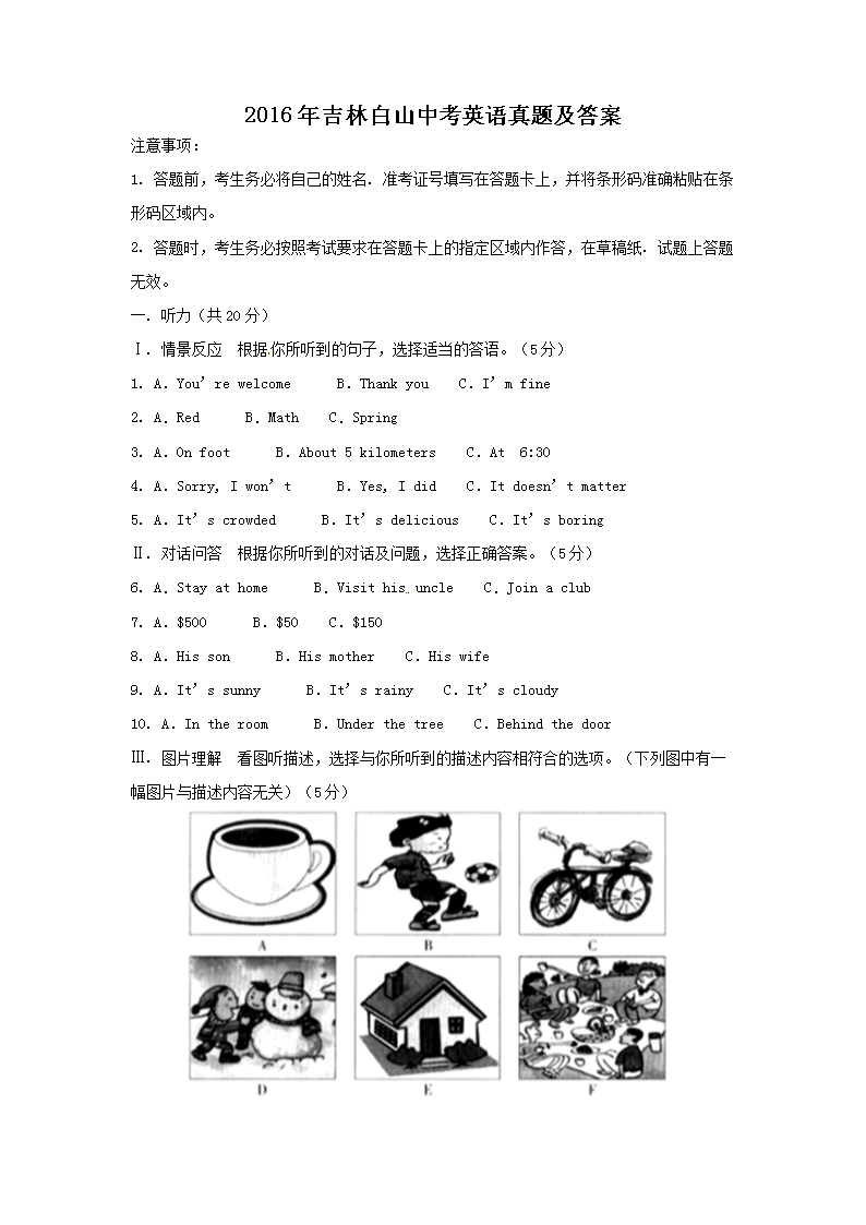 【文档名称】 2016年吉林白山中考英语真题及答案(Word版).doc