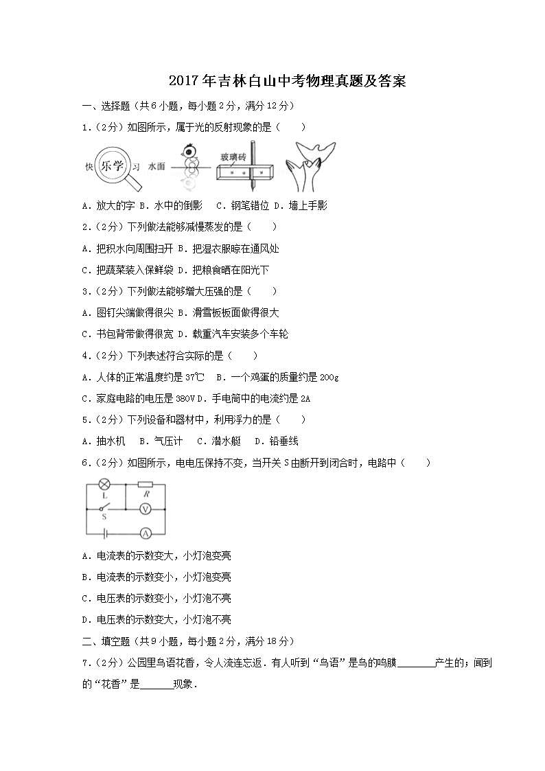 【文档名称】 2017年吉林白山中考物理真题及答案(Word版).doc