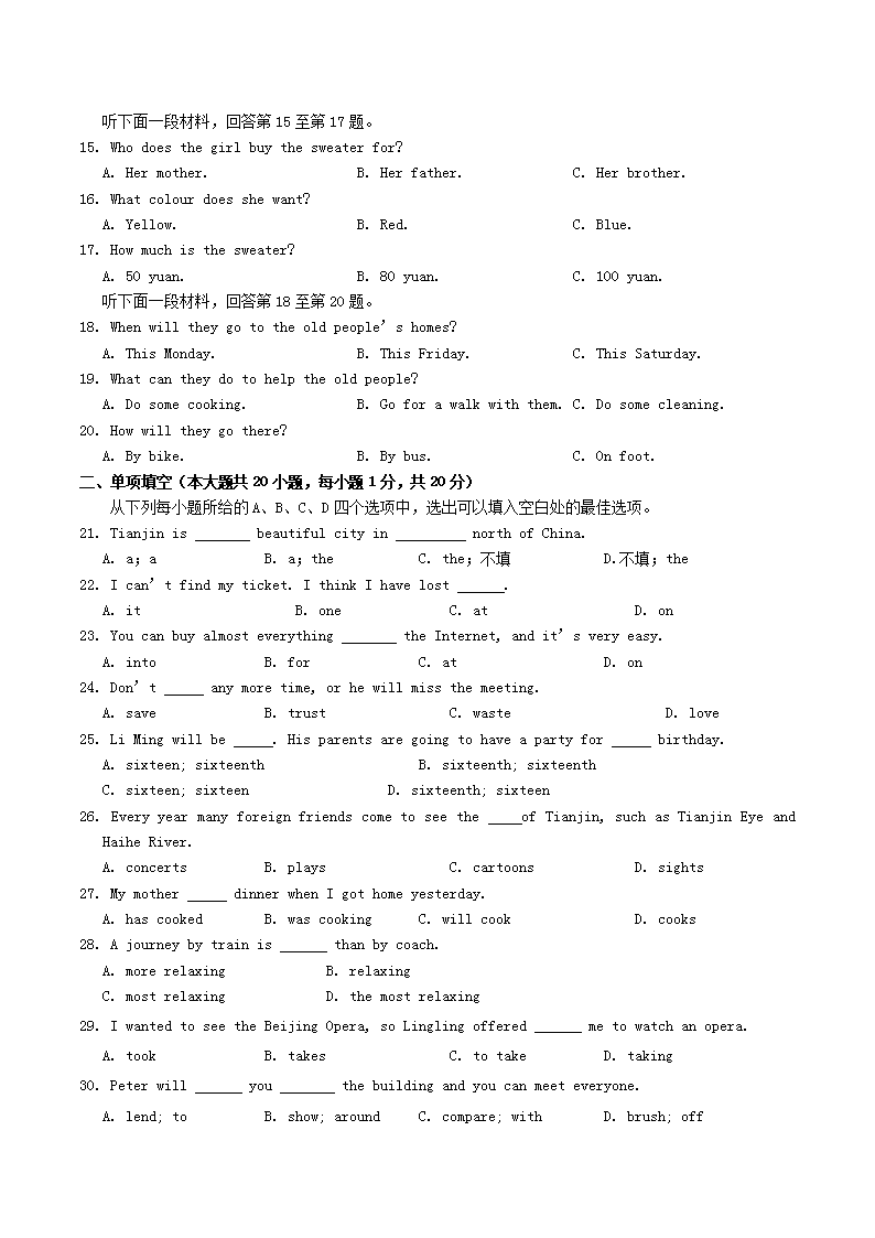 【文档名称】 2016天津河北区中考英语真题及答案(Word版).doc