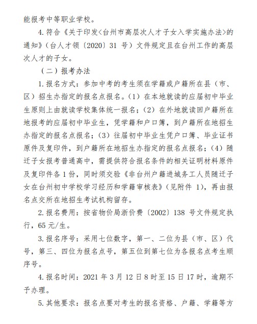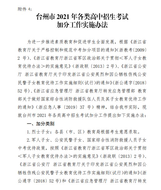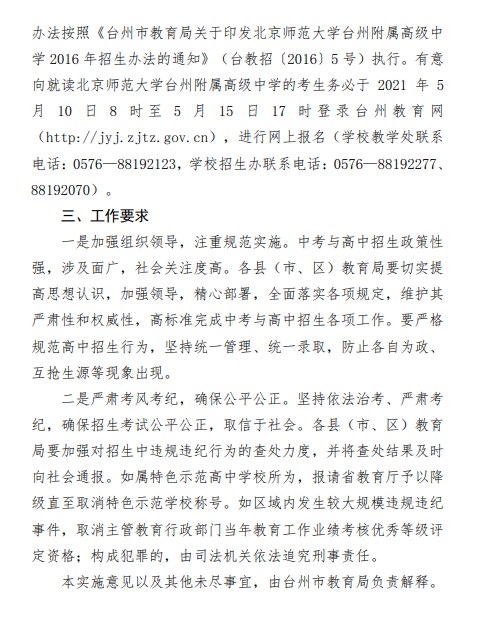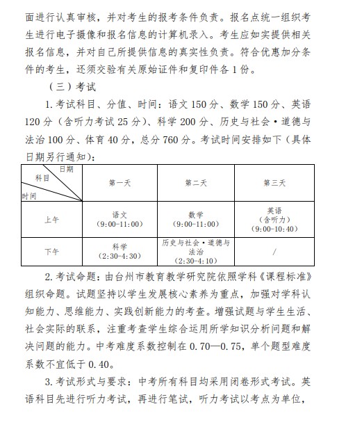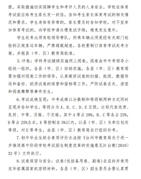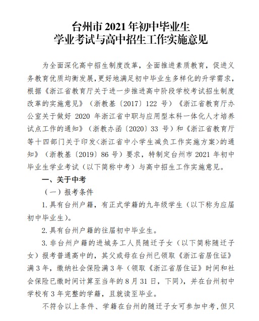 中考频道从台州市教育局获悉,2021年浙江台州初中毕业生学业考试与高中招生工作实施意见通知,详情如下: