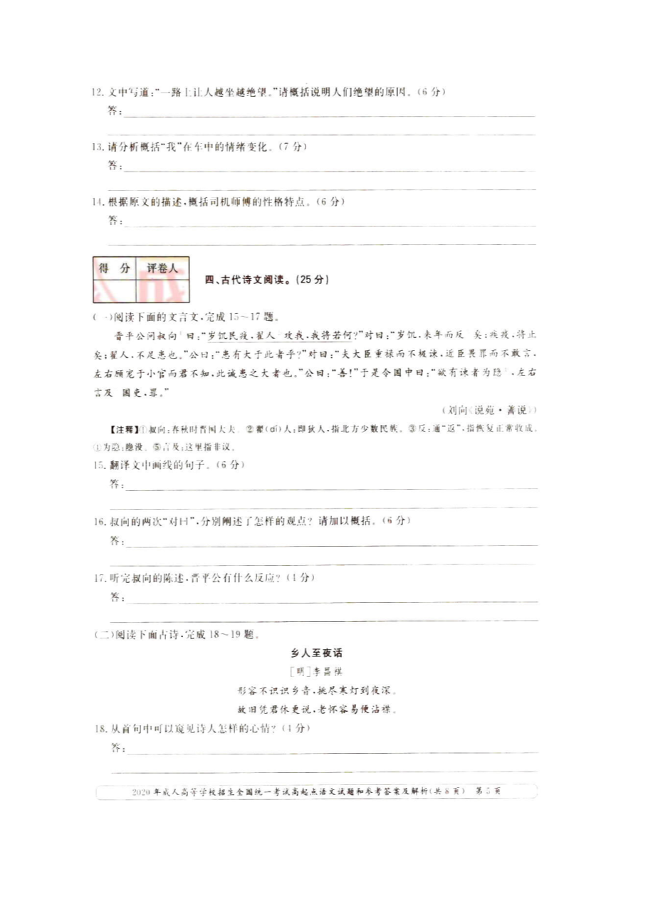【文档名称】 2020年四川成人高考高起点语文真题及答案(图片版).doc