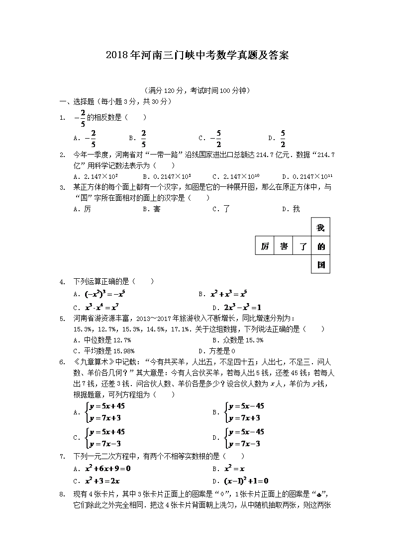 【文档名称】 2018年河南三门峡中考数学真题及答案(Word版).doc