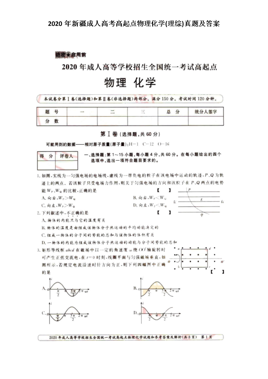 【文档名称】 2020年新疆成人高考高起点物理化学(理综)真题及答案(图片版).doc