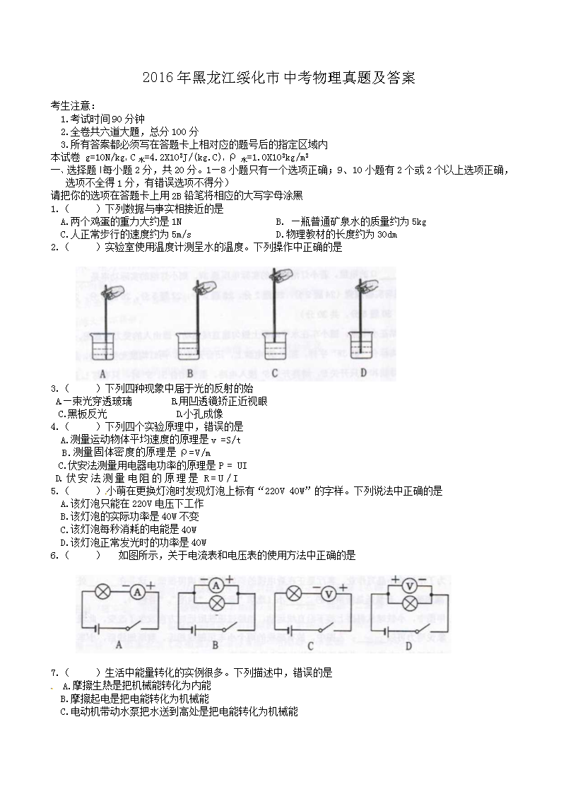 【文档名称】 2016年黑龙江绥化市中考物理真题及答案(Word版).doc