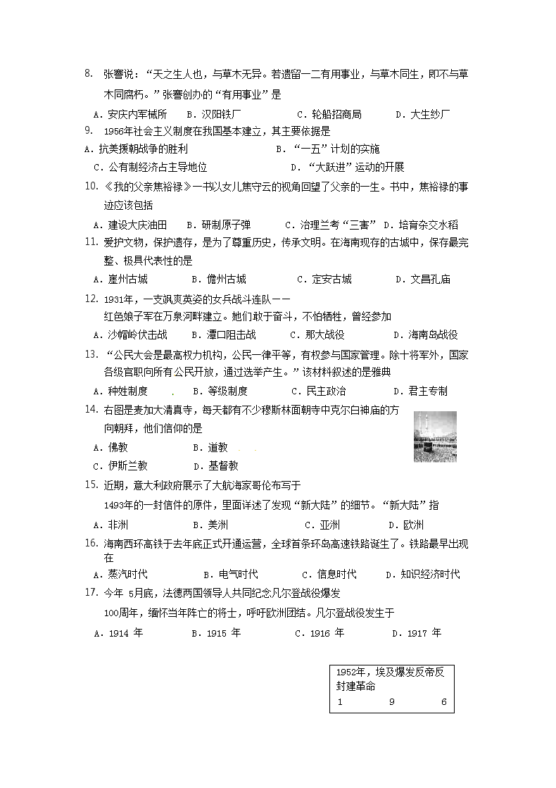 【文档名称】 2016年海南三亚中考历史真题及答案(Word版).doc