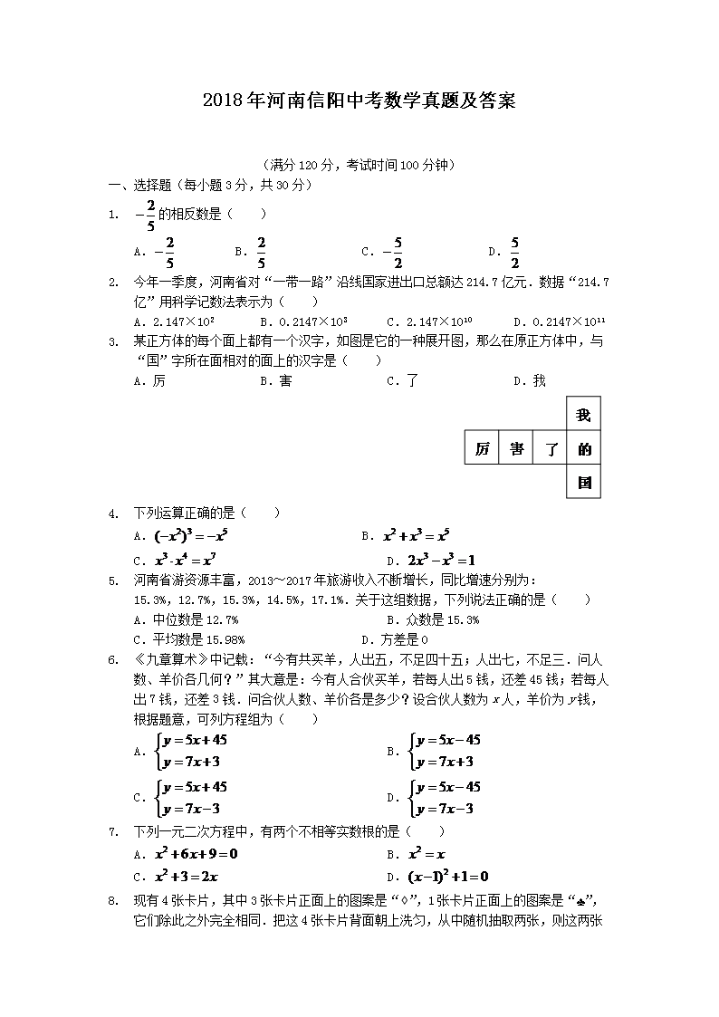 【文档名称】 2018年河南信阳中考数学真题及答案(Word版).doc
