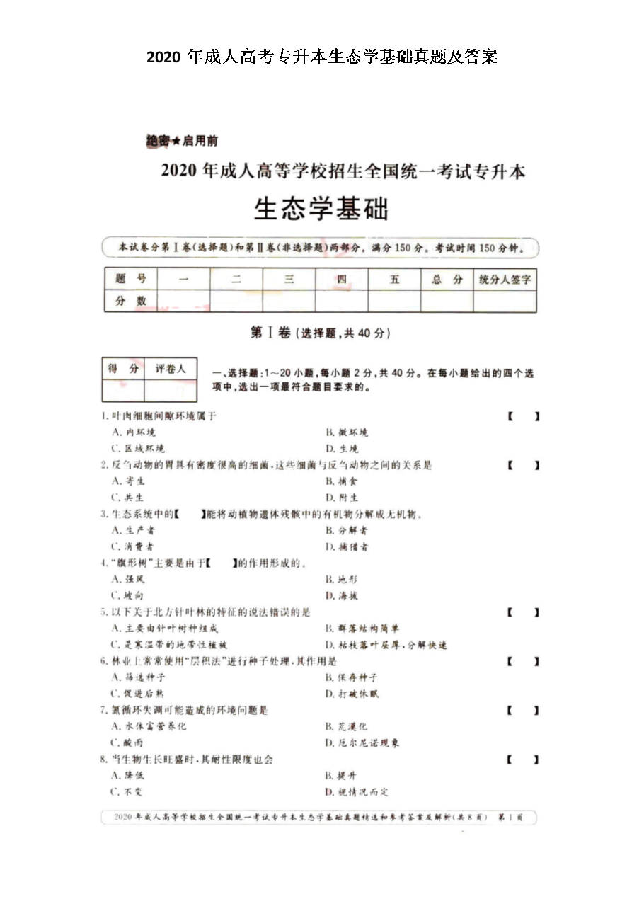 【文档名称】 2020年成人高考专升本生态学基础真题及答案(图片版).doc