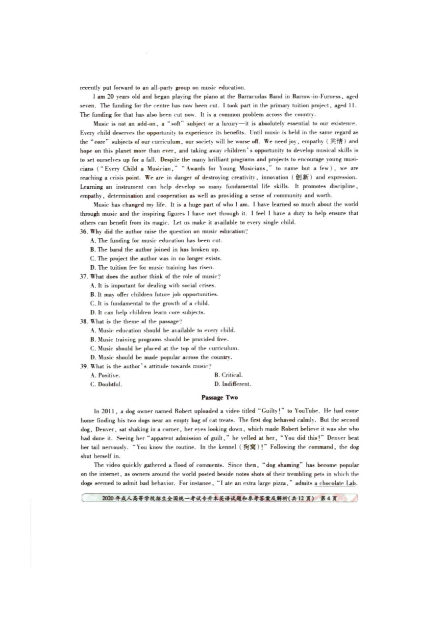 【文档名称】 2020年成人高考专升本英语真题及答案(图片版).doc