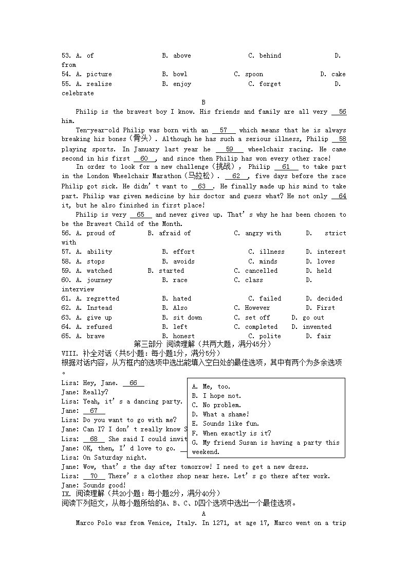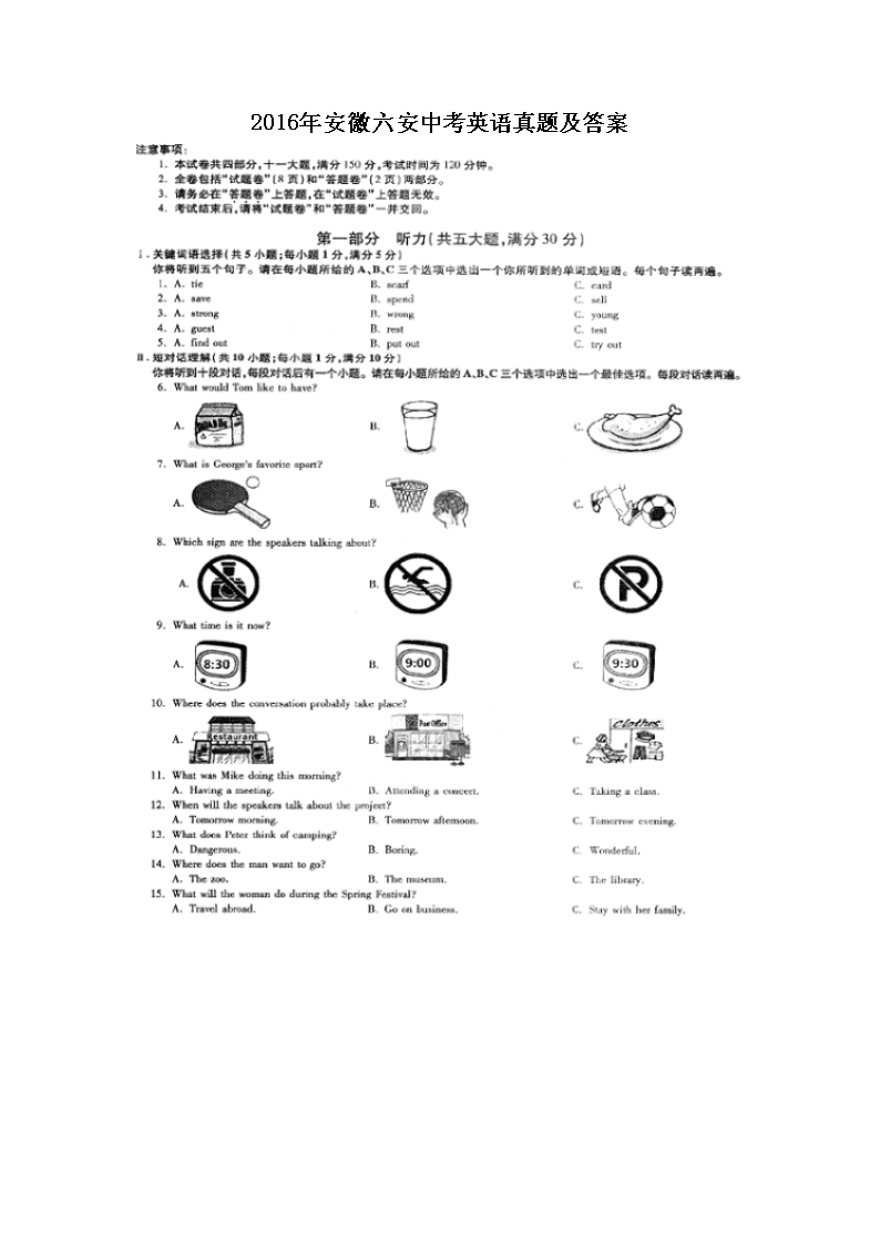 【文档预览】 无忧考网整理发布2016年安徽六安中考英语真题及答案(Word版),前五页预览如下: