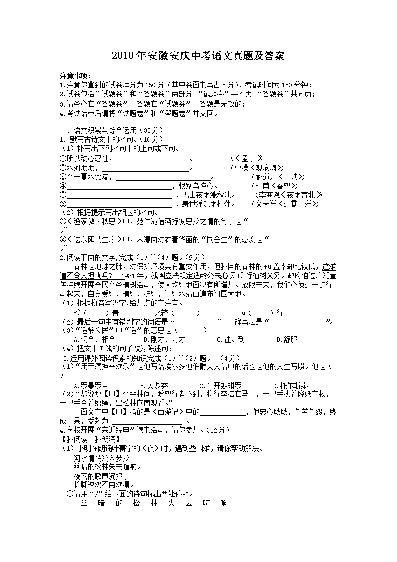 【文档名称】 2018年安徽安庆中考语文真题及答案(Word版).doc