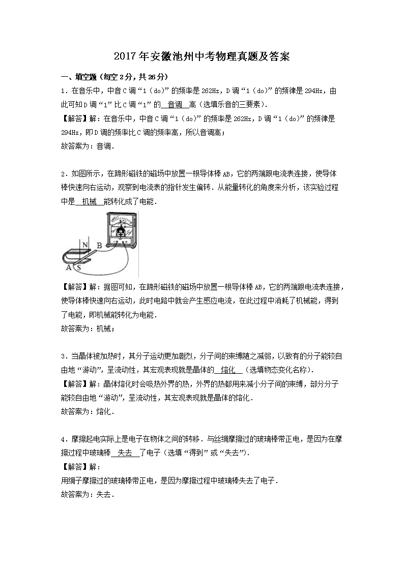 【文档名称】 2017年安徽池州中考物理真题及答案(Word版).doc