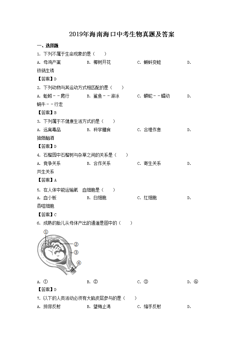 【文档预览】 无忧考网整理发布2019年海南海口中考生物真题及答案(Word版),前五页预览如下:
