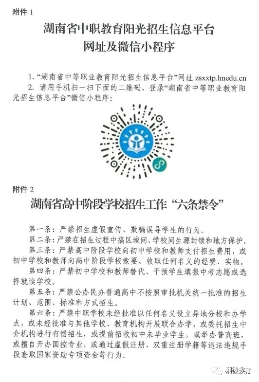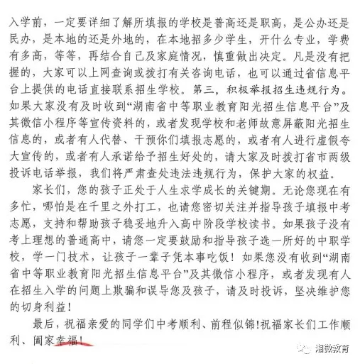 考网从湖南省教育厅了解到,又到中考招生季,为了打击招生欺诈行为,推进阳光招生,近日,湖南省教育厅发布了致全省应届初三学生及家长的一封公开信,现将有关事宜通知如下:
