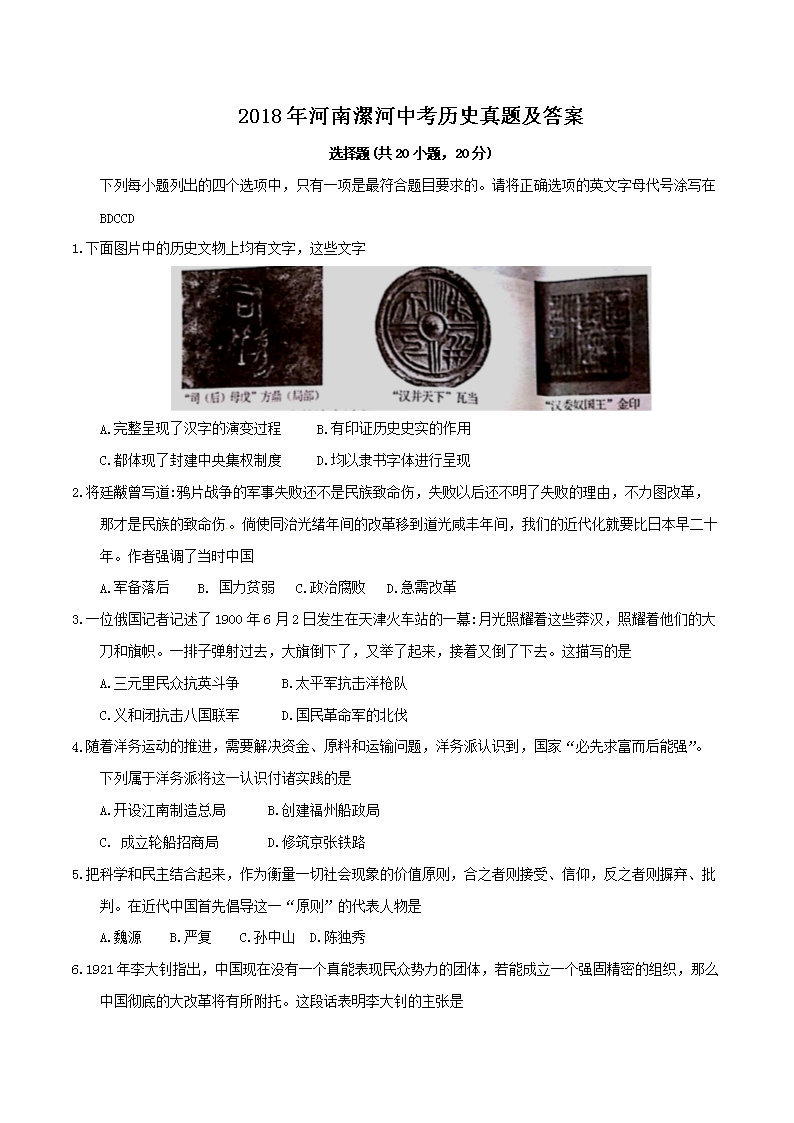 【文档名称】 2018年河南漯河中考历史真题及答案(Word版).doc