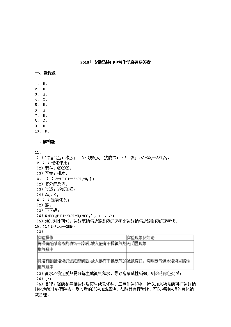 【文档预览】 无忧考网整理发布2016年安徽马鞍山中考化学真题及答案(Word版),前五页预览如下: