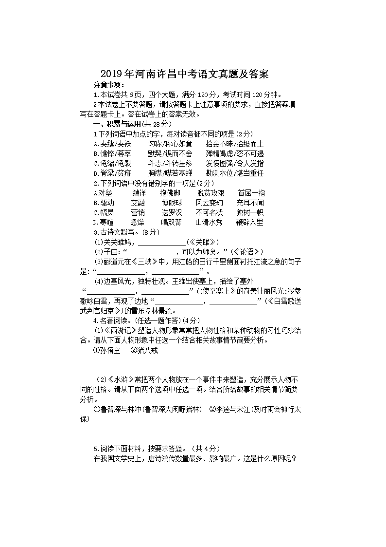 【文档名称】 2019年河南许昌中考语文真题及答案(Word版).doc