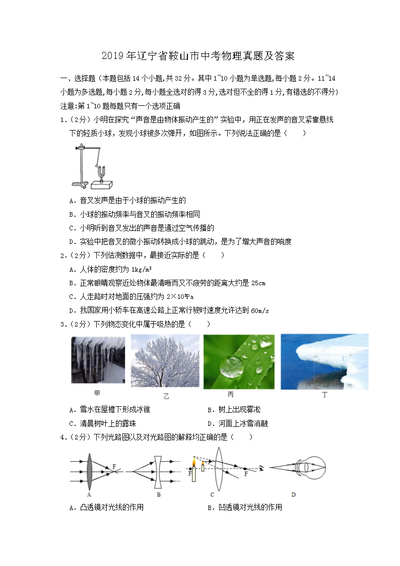【文档预览】 无忧考网整理发布2019年辽宁省鞍山市中考物理真题及答案(Word版),前五页预览如下: