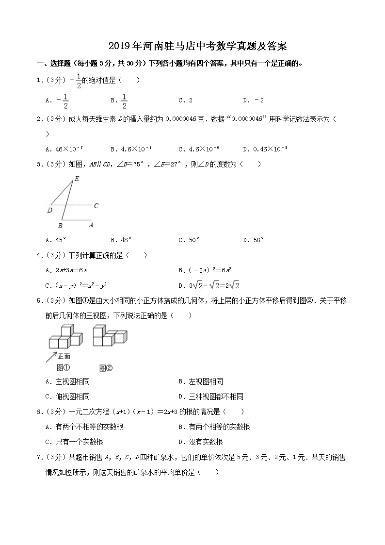 【文档名称】 2019年河南驻马店中考数学真题及答案(Word版).doc