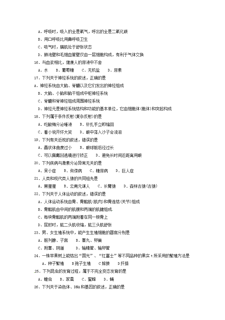 【文档名称】 2015年云南怒江中考生物真题及答案(Word版).doc