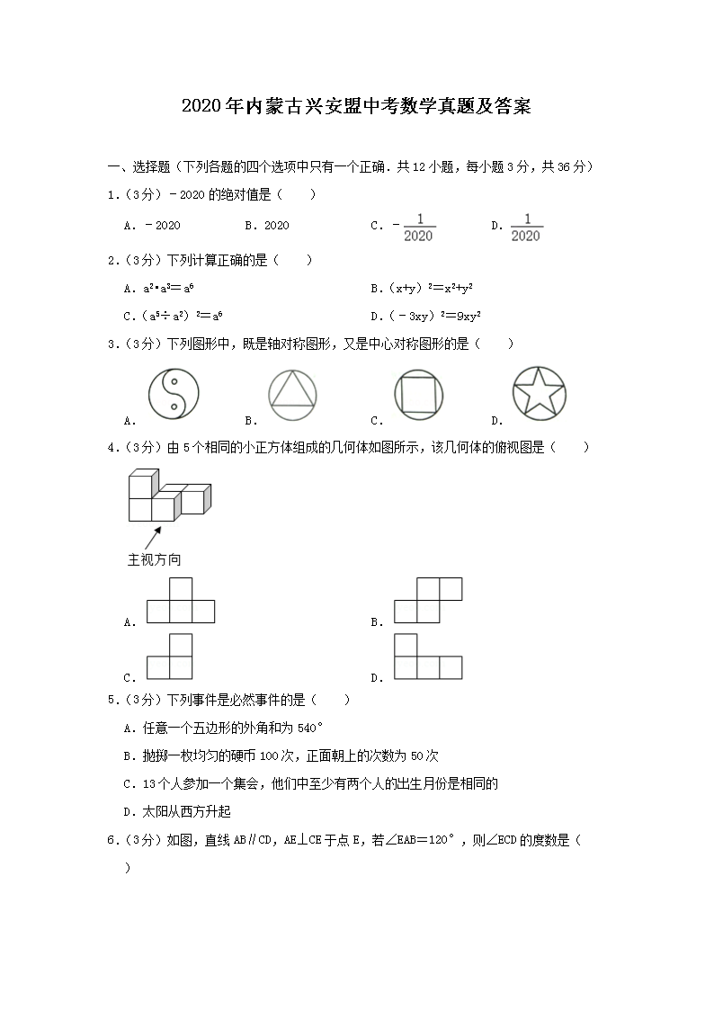 【文档名称】 2020年内蒙古兴安盟中考数学真题及答案(Word版).doc