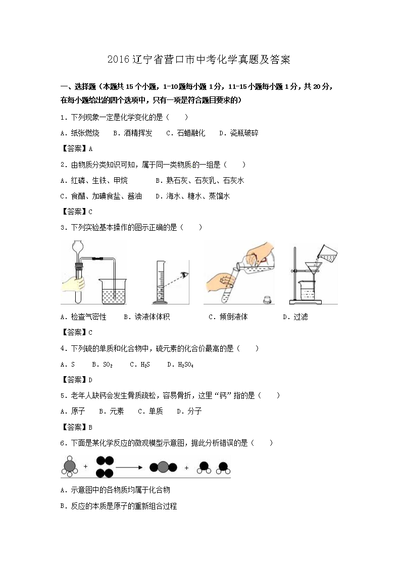 【文档预览】 无忧考网整理发布2016辽宁省营口市中考化学真题及答案(Word版),前五页预览如下:
