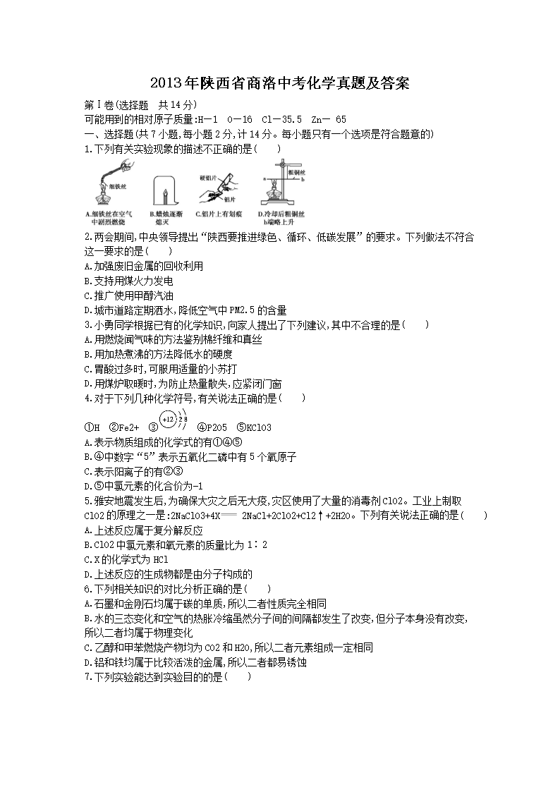 【文档名称】 2013年陕西省商洛中考化学真题及答案(Word版).doc