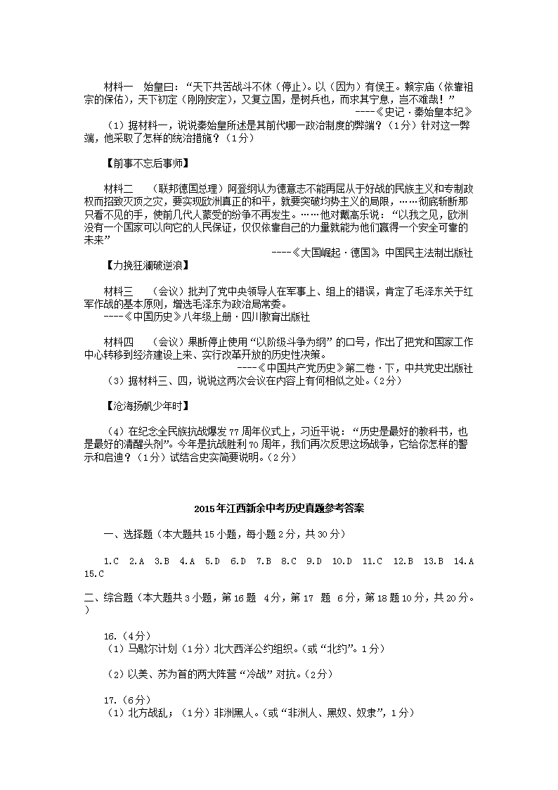 【文档名称】 2015年江西新余中考历史真题及答案(Word版).doc