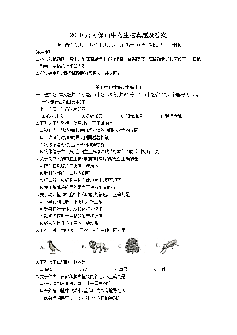 【文档预览】 无忧考网整理发布2020云南保山中考生物真题及答案(Word版),前五页预览如下: