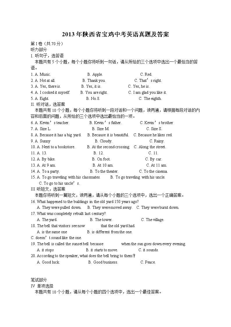 【文档名称】 2013年陕西省宝鸡中考英语真题及答案(Word版).doc