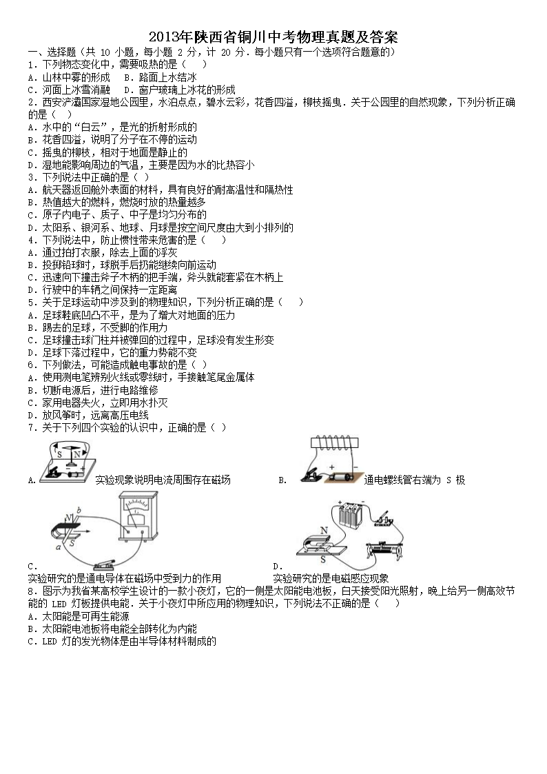 【文档名称】 2013年陕西省铜川中考物理真题及答案(Word版).doc