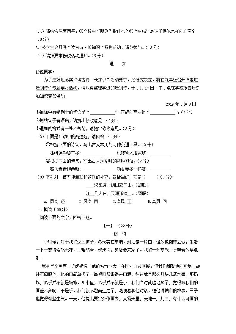 【文档名称】 2019年安徽滁州中考语文真题及答案(Word版).doc