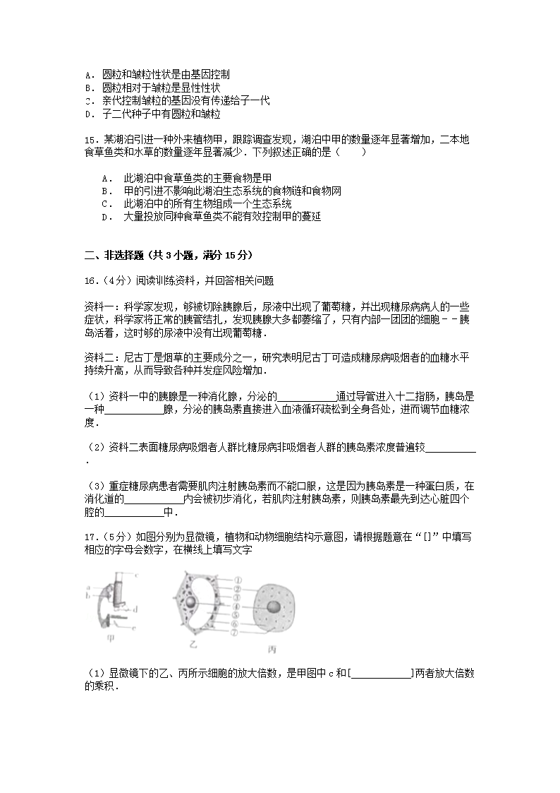 【文档名称】 2015年江西新余中考生物真题及答案(Word版).doc