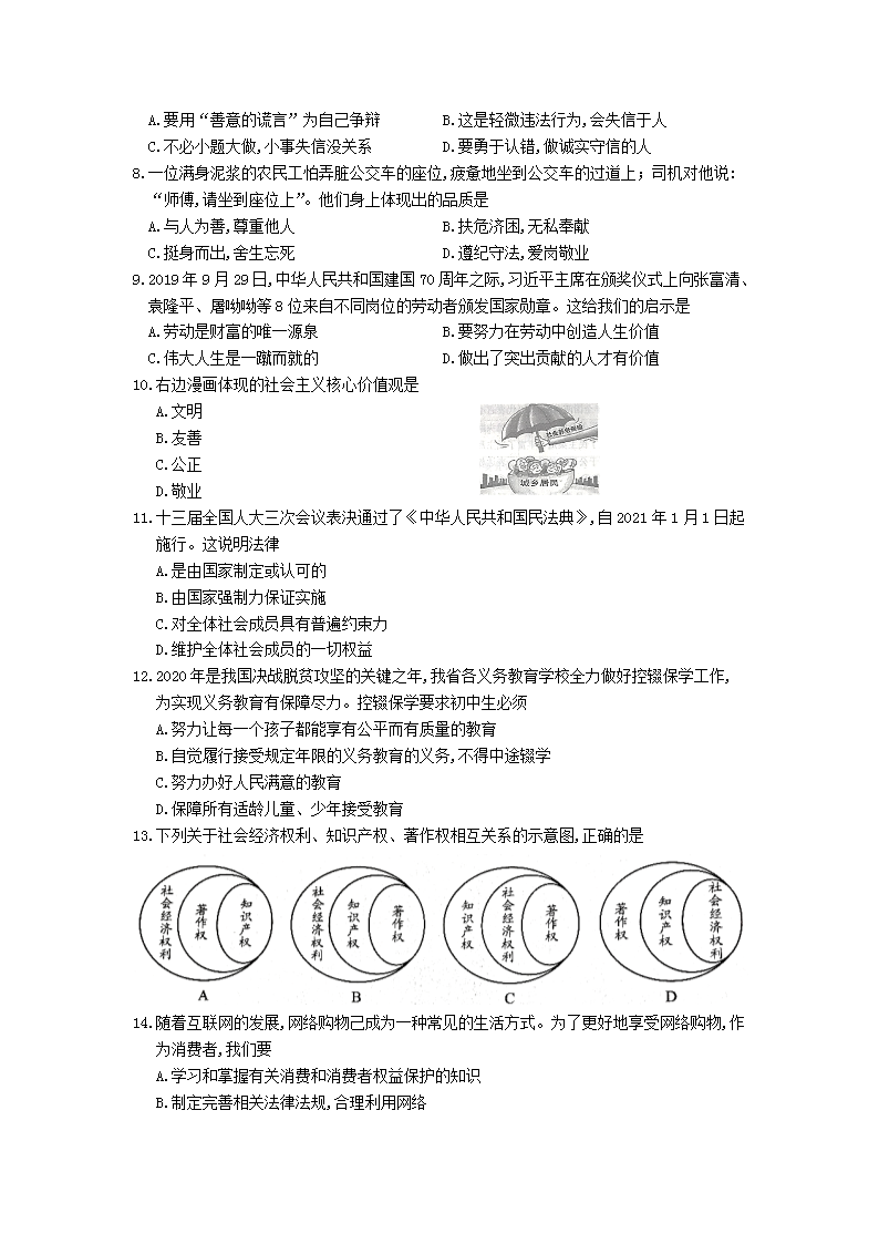 【文档名称】 2020云南楚雄中考道德与法治真题及答案(Word版).doc