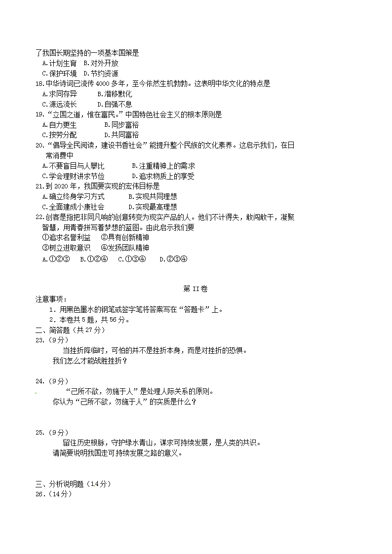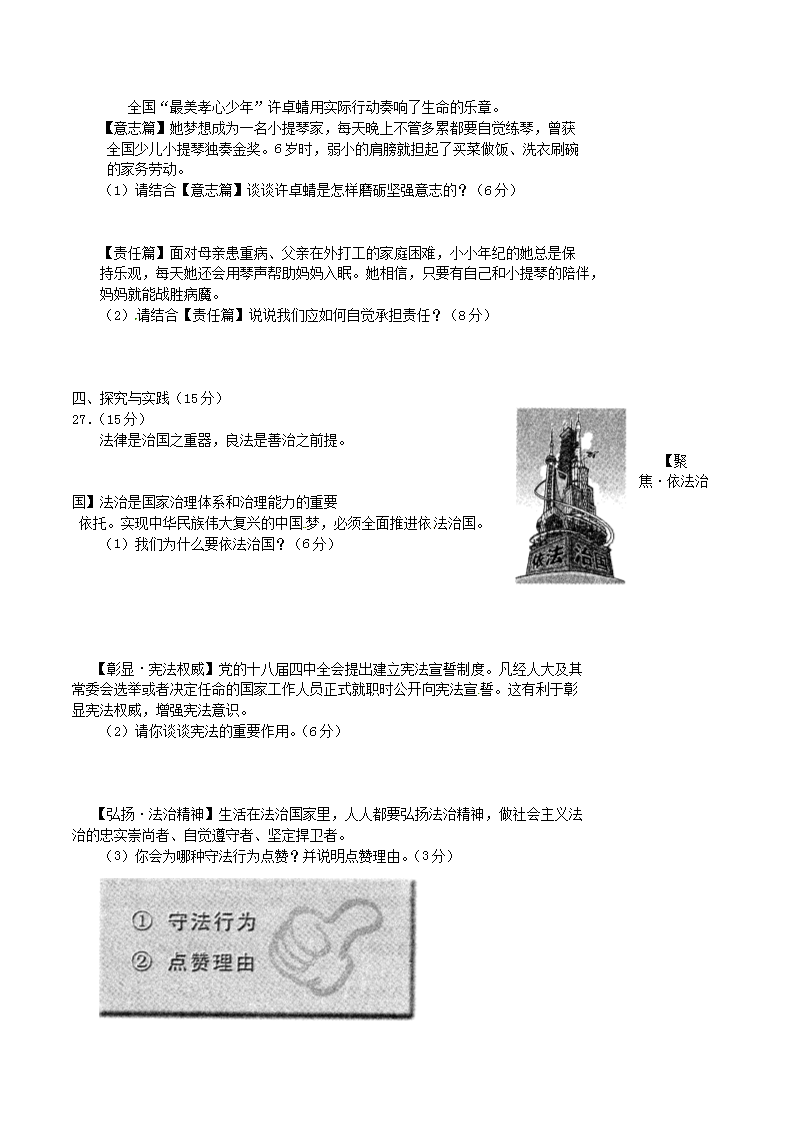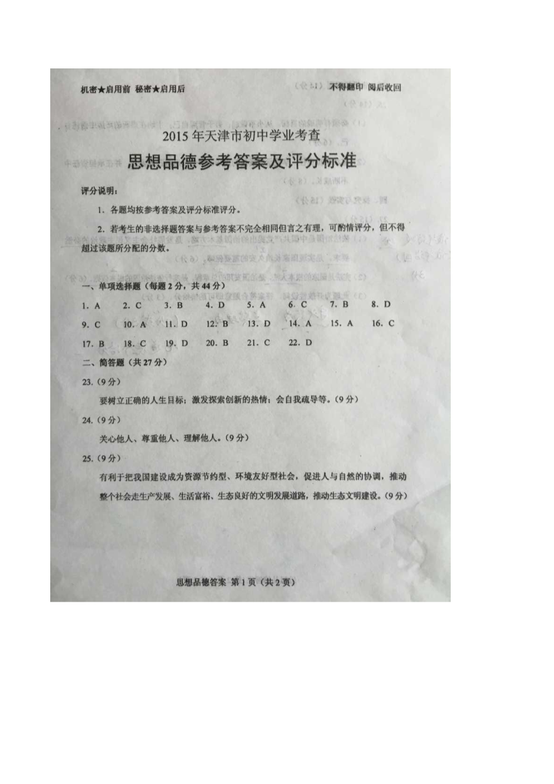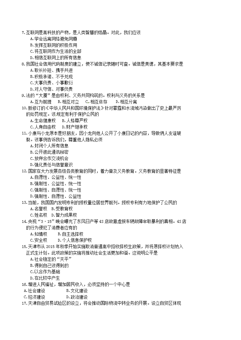 【文档名称】 2015天津塘沽中考思想品德真题及答案(Word版).doc