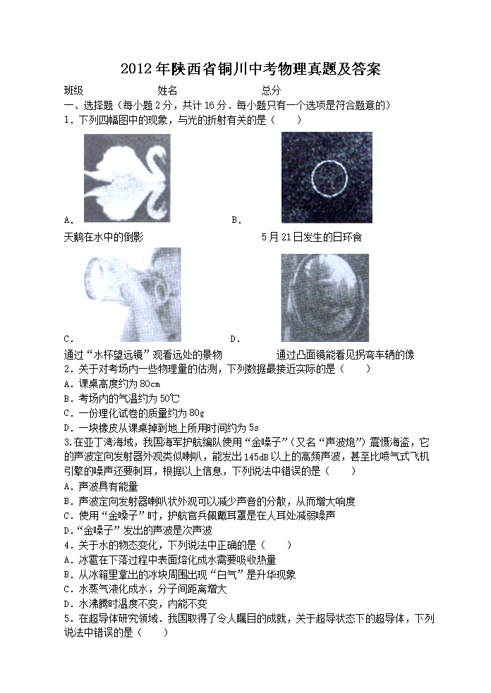 【文档名称】 2012年陕西省铜川中考物理真题及答案(Word版).doc