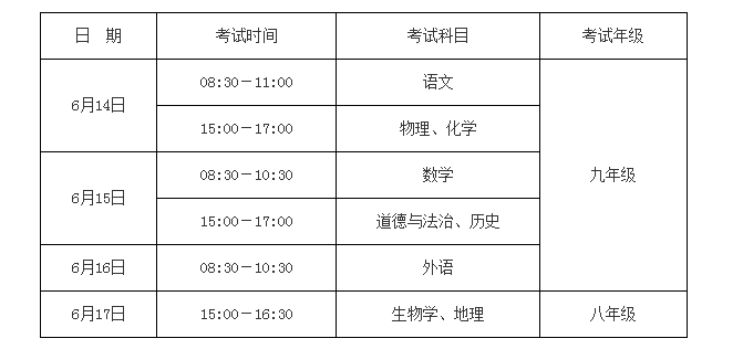 (1)九年级。道德与法治、语文、数学、外语、历史、物理、化学。科目分值为:语文150分,数学150分,外语120分(含听力20分),道德与法治80分,历史70分,物理70分,化学40分。语文、数学、外语、物理、化学实行闭卷考试,语文考试允许使用正版学生字典。道德与法治、历史考试允许携带教科书等相关资料。各学科考试均不允许使用计算器。