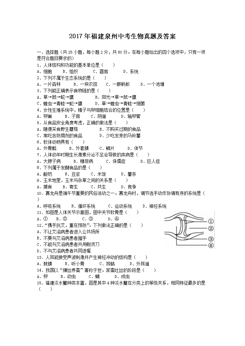 【文档预览】 无忧考网整理发布2017年福建泉州中考生物真题及答案(Word版),前五页预览如下: