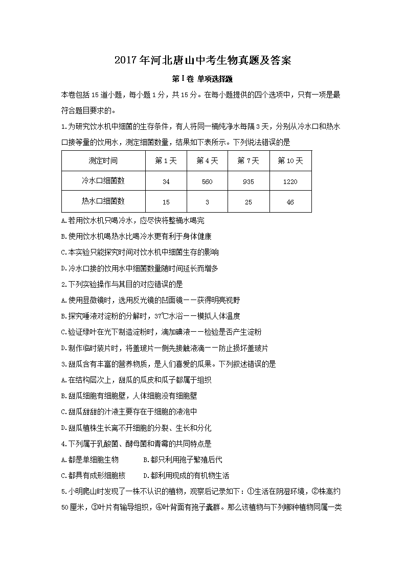 【文档预览】 无忧考网整理发布2017年河北唐山中考生物真题及答案(Word版),前五页预览如下: