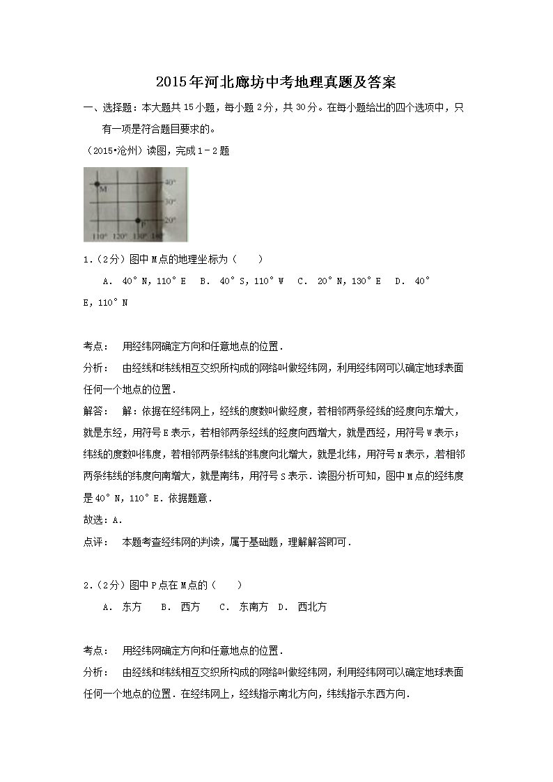 【文档名称】 2015年河北廊坊中考地理真题及答案(Word版).doc