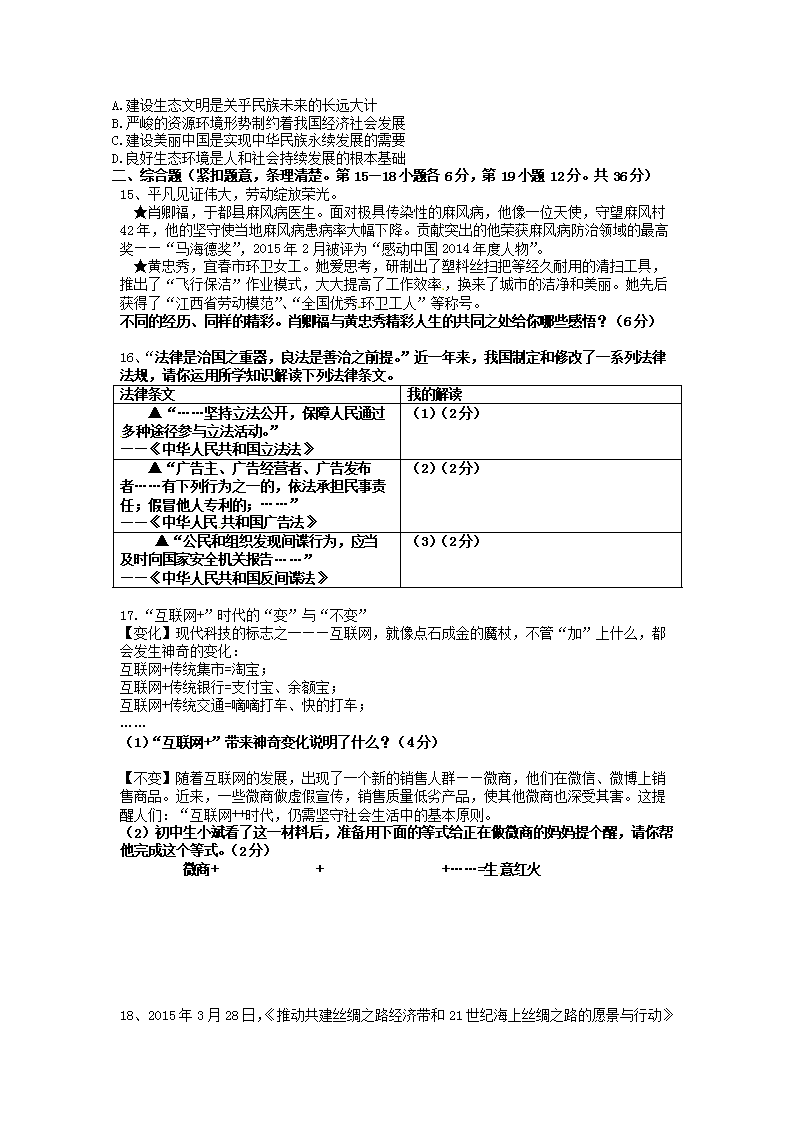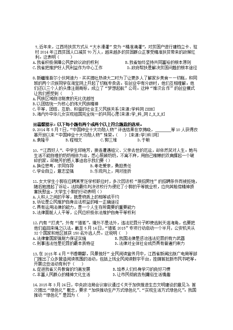 【文档名称】 2015年江西中考政治真题及答案(Word版).doc
