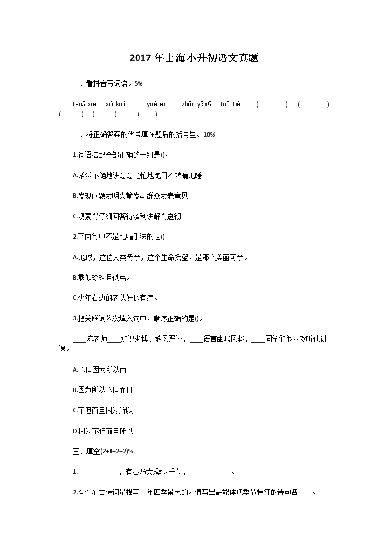 【文档名称】 2017年上海小升初语文真题(Word版).doc