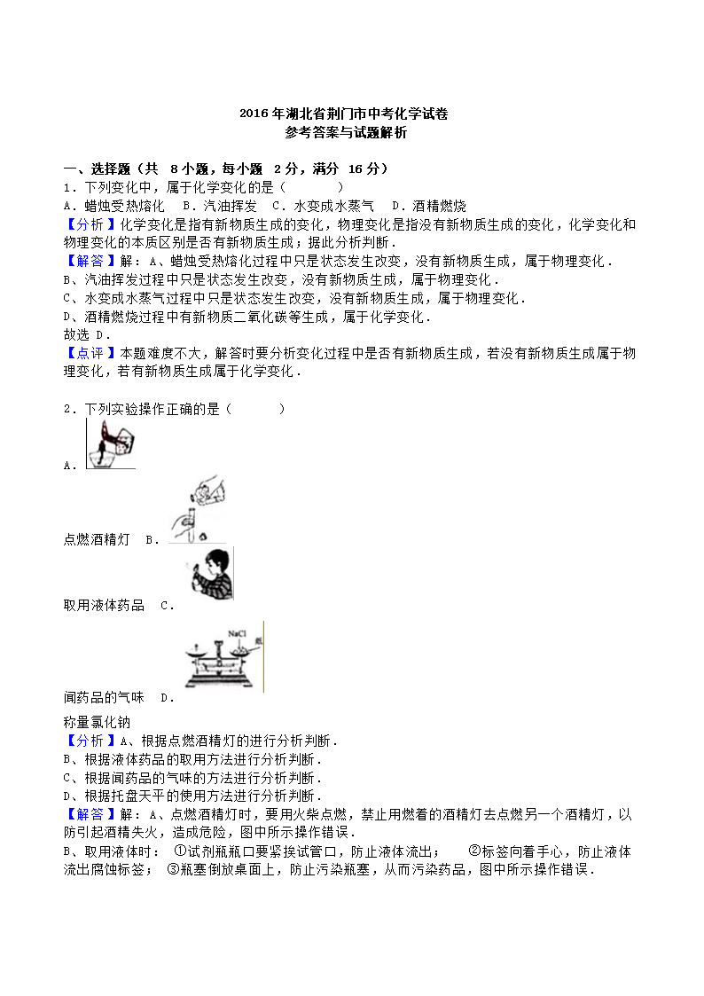 【文档预览】 无忧考网整理发布2016年湖北省荆门市中考化学真题及答案(Word版),前五页预览如下: