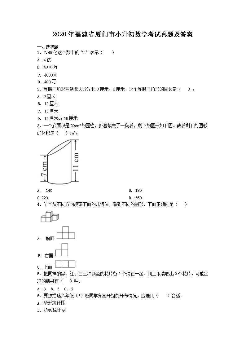 【文档名称】 2020年福建省厦门市小升初数学考试真题及答案(Word版).doc