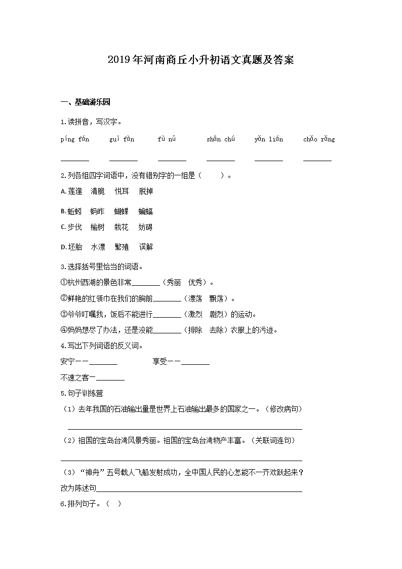 【文档名称】 2019年河南商丘小升初语文真题及答案(Word版).doc