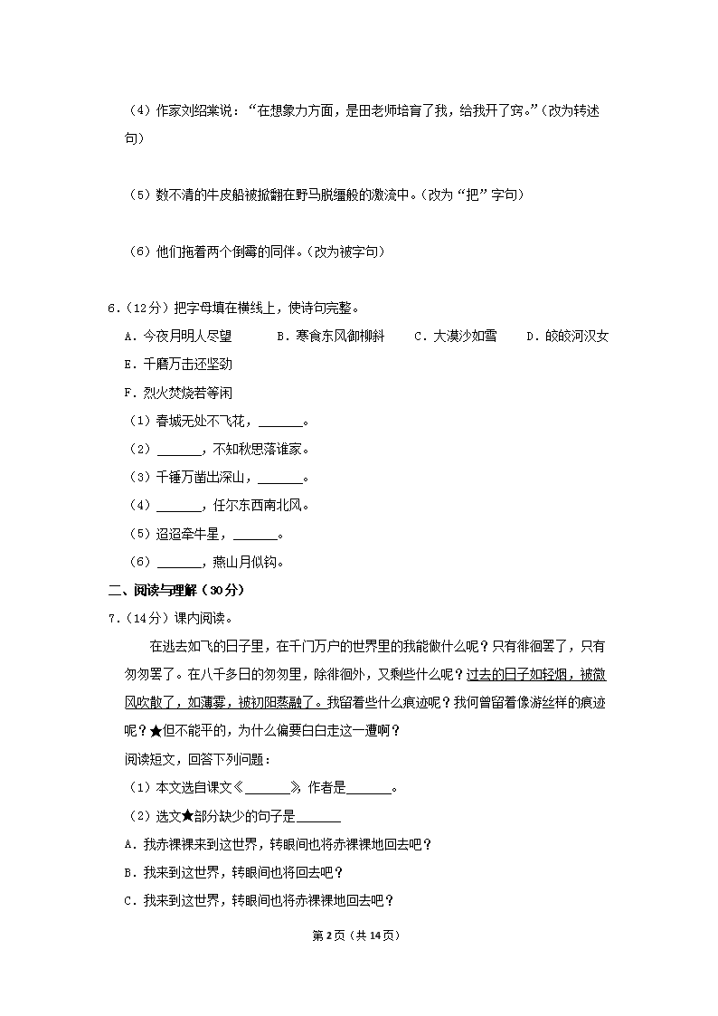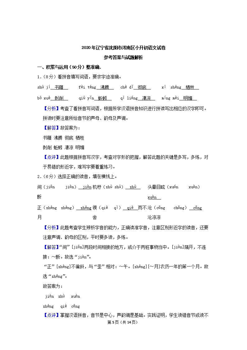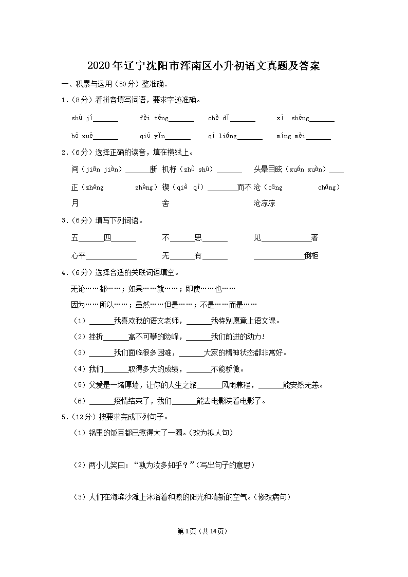 【文档预览】 无忧考网整理发布2020年辽宁沈阳市浑南区小升初语文真题及答案(Word版),前五页预览如下: