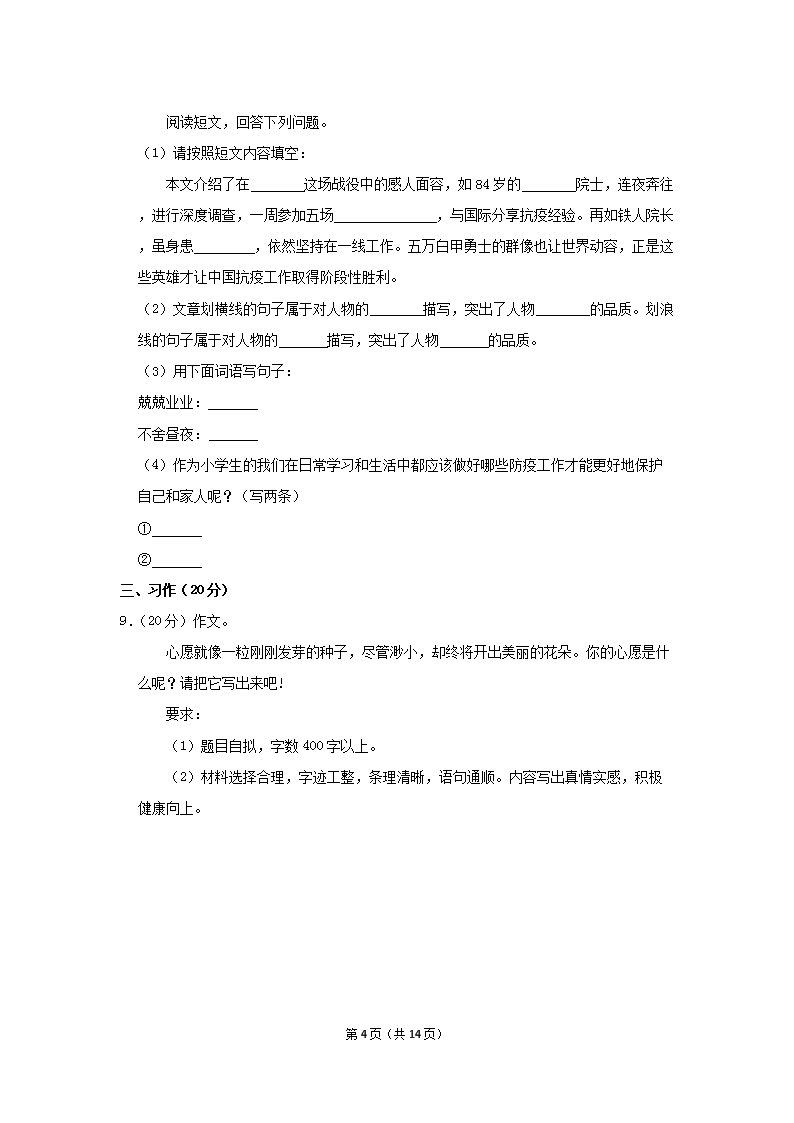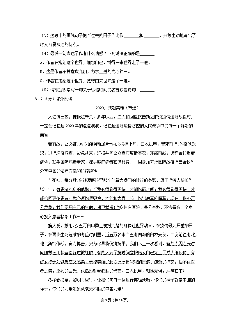 【文档名称】 2020年辽宁沈阳市浑南区小升初语文真题及答案(Word版).doc