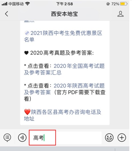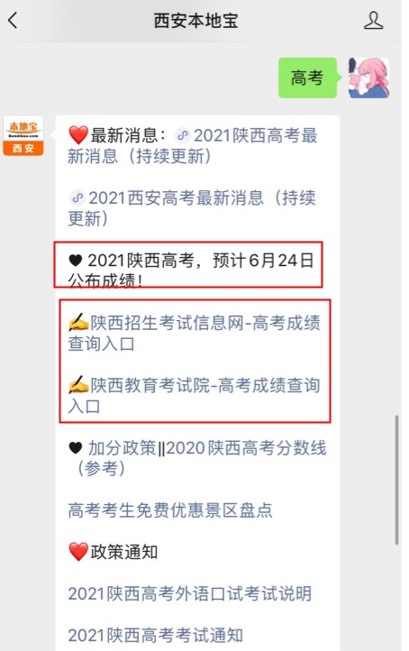 2、微信查分:信息搜索公众号【西安本地宝】,关注后在聊天对话框中回复【高考】,可在线查阅陕西、西安最新高考消息,考生免费游景区盘点、高考真题答案解析、成绩查询、志愿填报、录取分数线等持续更新中。