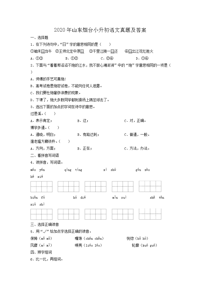 【文档名称】 2020年山东烟台小升初语文真题及答案(Word版).doc