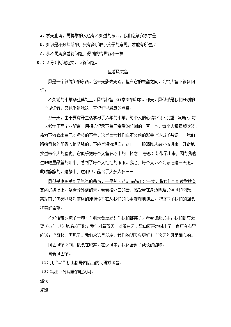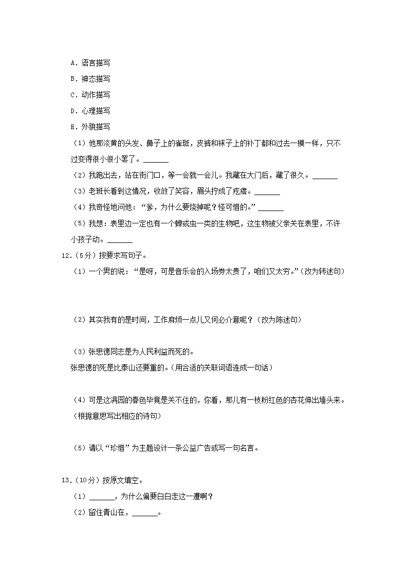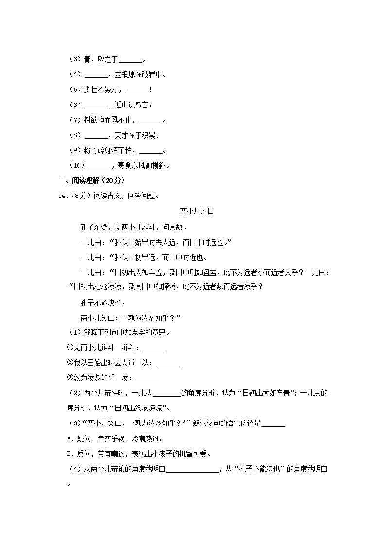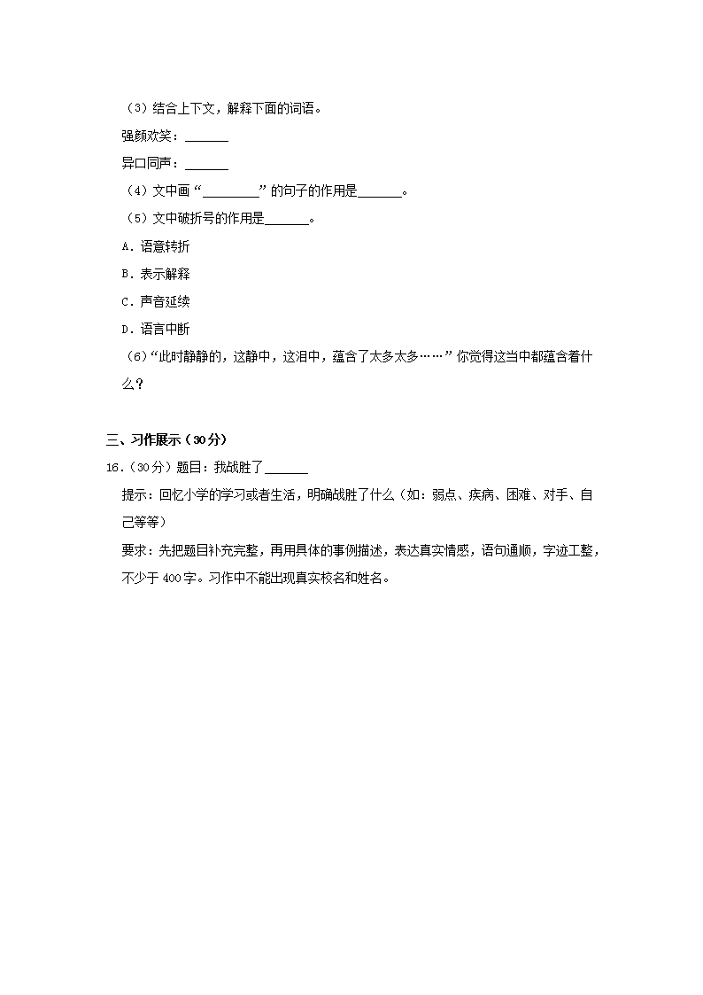 【文档名称】 2020年甘肃平凉市小升初语文真题及答案(Word版).doc